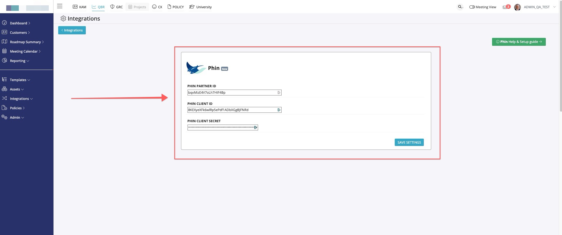 3. Navigate inside vCIOToolbox to the Phin Integration. This can be found inside either the QBR or GRC modules, and it can be accessed by going to Integrations > Settings > Phin Security.