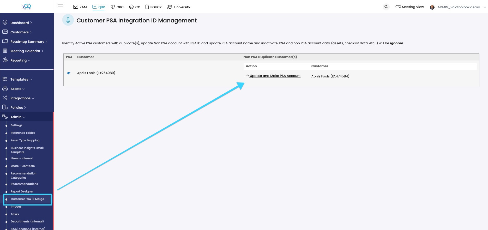 4. Once both records are active (ensure the names are EXACT) you can navigate to Admin > Cusotmer PSA Merge and you can then merge the records.