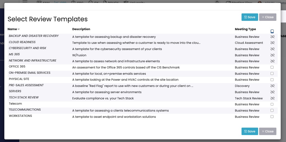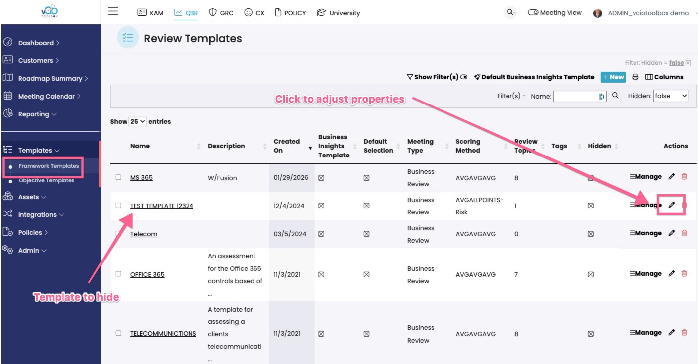 Occasionally, you'll want to archive a template without losing the history tied to it. Inside vCIOToolbox, you can hide any template, keeping it connected to any open assessments while still allowing it to be used. But ensuring that users cannot select that template going forward for new assessments.