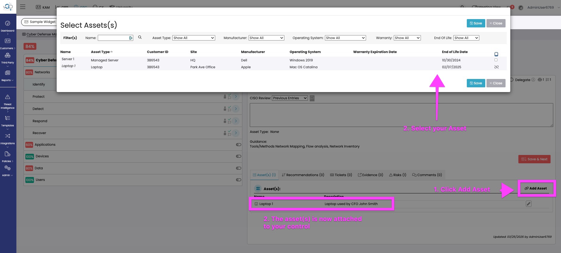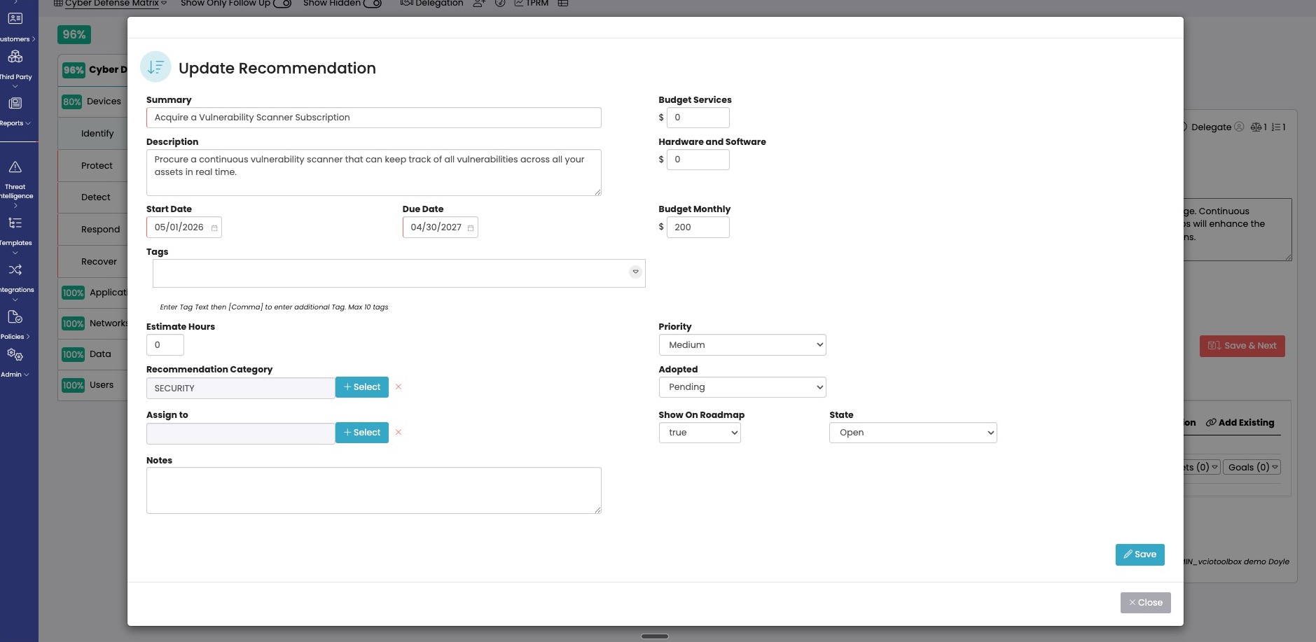 6. Once the recommendation is created yoiur can add assets, risks, or commendats to the Recommendation.